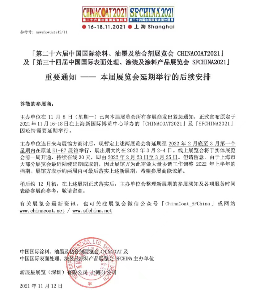 2021年11月16日至18日在上海舉行的「中國國際涂料展CHINACOAT2021」及「中國國際表面處理展SFCHINA2021」現(xiàn)已定于2022 年 3 月 2 日至 4 日在原定的中國上海新國際博覽中心E1 至 E7 展館舉行。